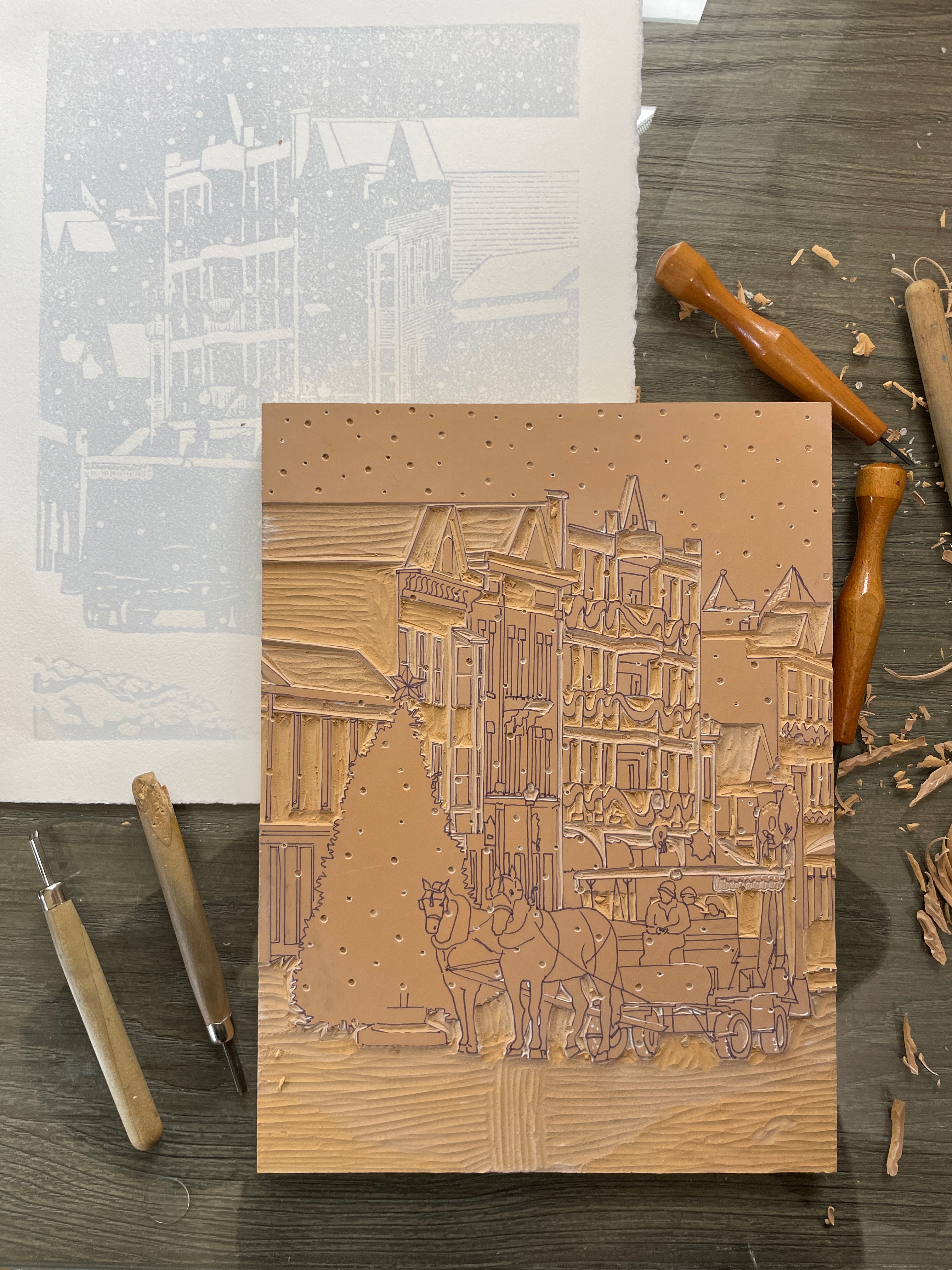 Small Town Christmas Original Block Print