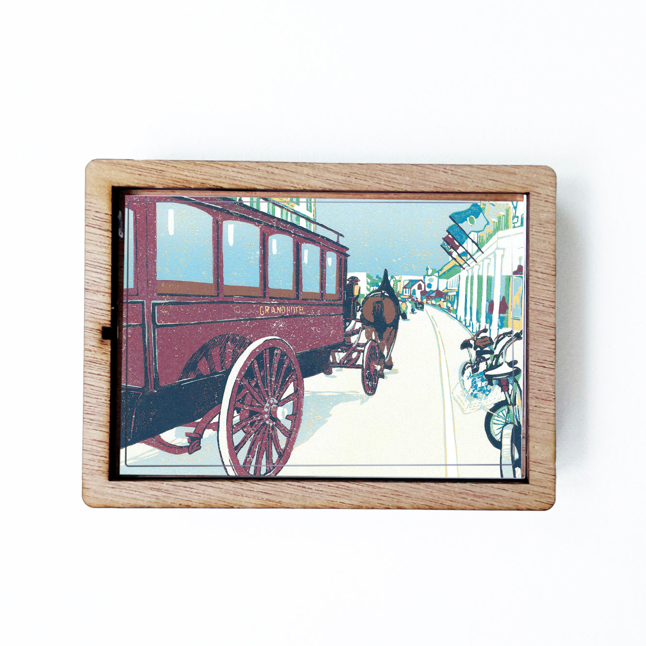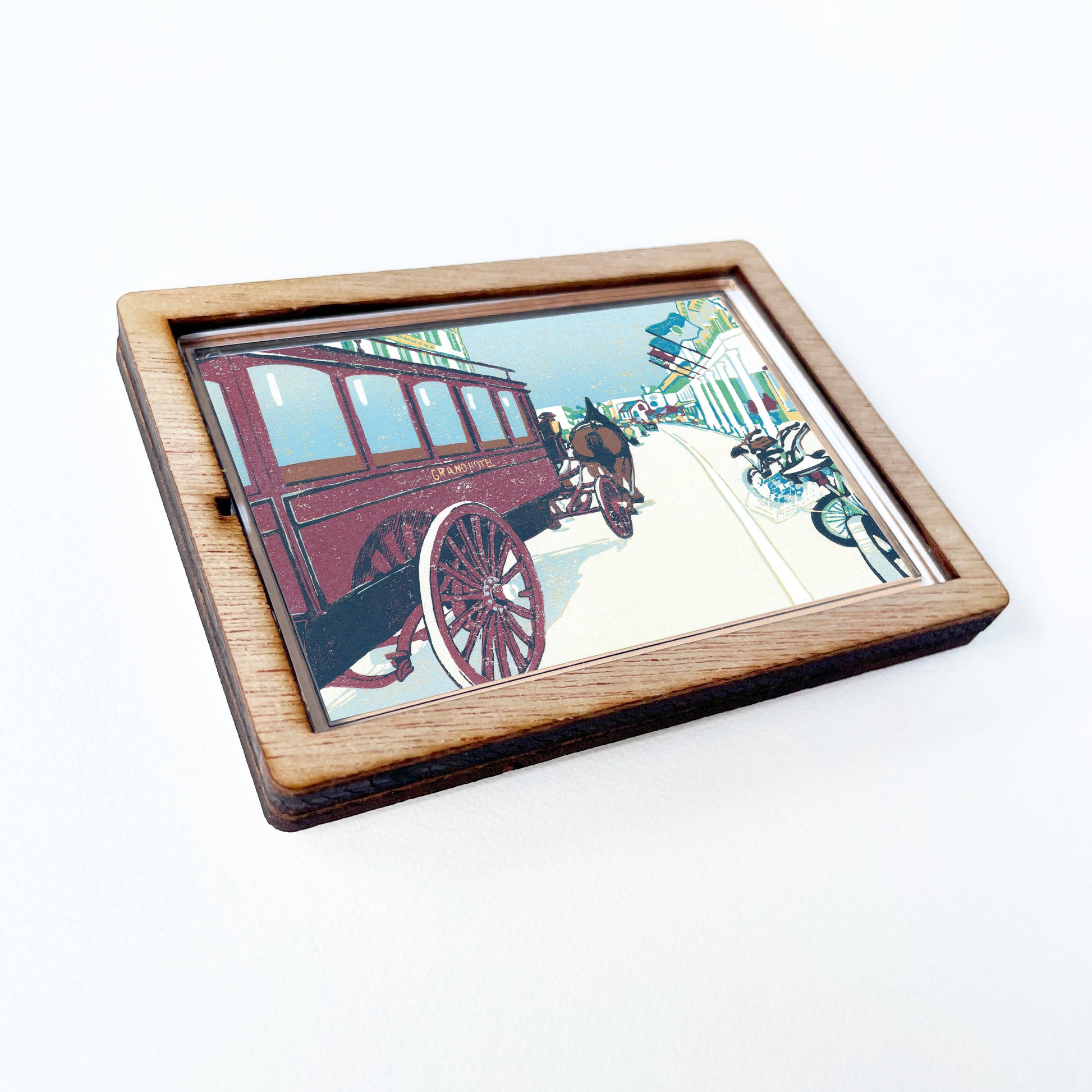 Decorate your fridge, locker or any other metal surface with this charming magnet featuring a solid wood frame and clear lens. The design is a reproduction of a contemporary block print by Natalia Wohletz.