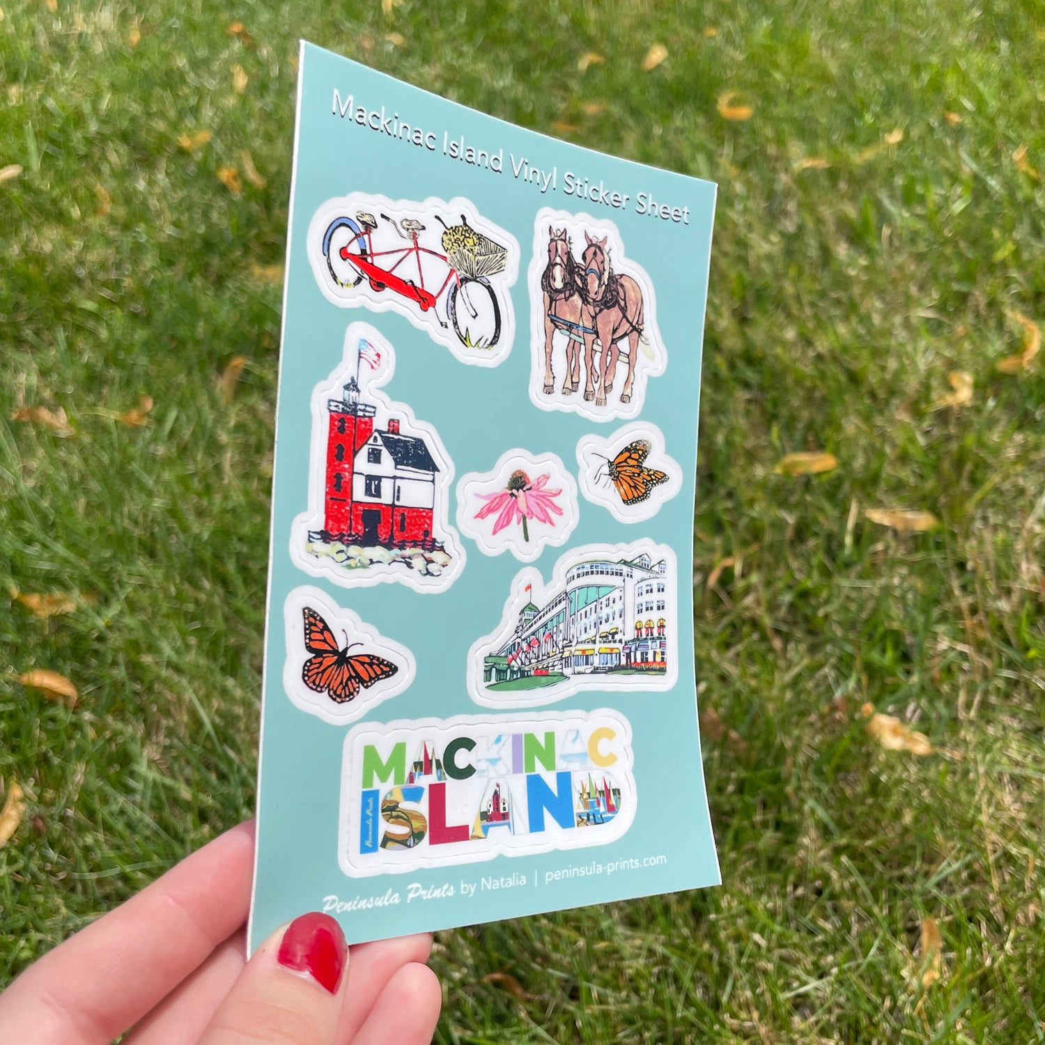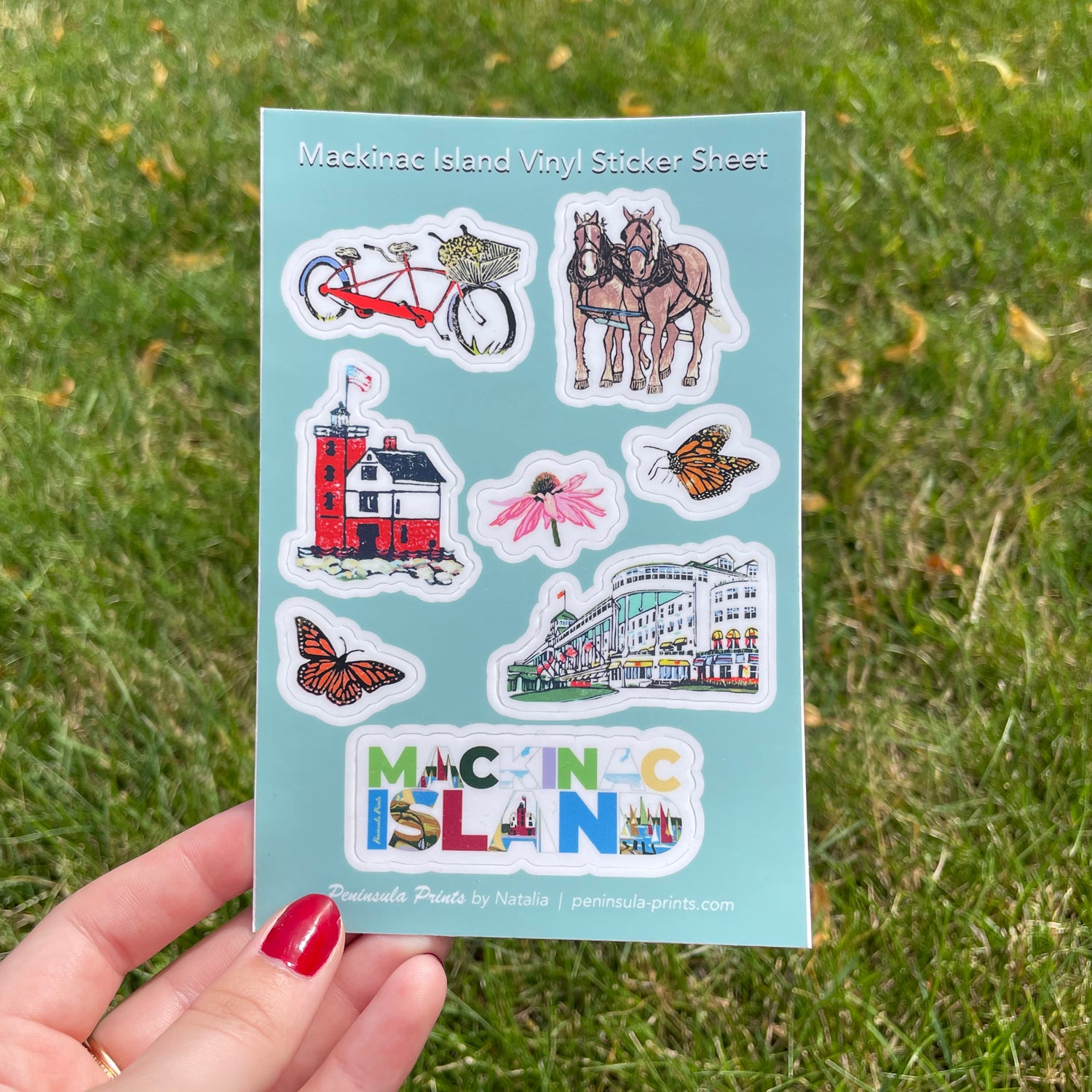 Description: Each sticker sheet features block print designs inspired by scenes of Mackinac Island, Michigan, including the Grand Hotel, a team of dray horses, butterflies, flowers and Round Island Lighthouse. Featuring artwork by Mackinac Island artist Natalia Wohletz of Peninsula Prints.